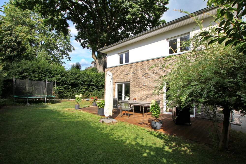 Der Garten ist uneinsehbar. Die zum Garten ebene Terrasse ist aus hochwertigem Bankiraiholz. Der Garten ist pflegeleicht angelegt und die Rasenpflege erledigt der Roboter.